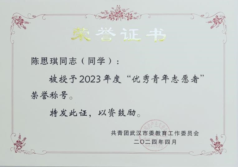 大学三年,陈思琪自己不满足于在学校里的成长和进步,还投身各种社会实践,增长学习经验和应用知识的能力。每年她都会参加“返家乡”实践,积极为家乡落实“乡村振兴”发展战略建言献策,曾参加武汉空港马拉松医疗志愿者、是“金辉助老”志愿服务推动者。在校期间,陈思琪累计志愿服务时长达756余小时,服务事迹多次被校内外媒体报道,2024年,陈思琪荣获武汉市2024年度“优秀青年志愿者”、校“志愿服务先进工作者”等称号。