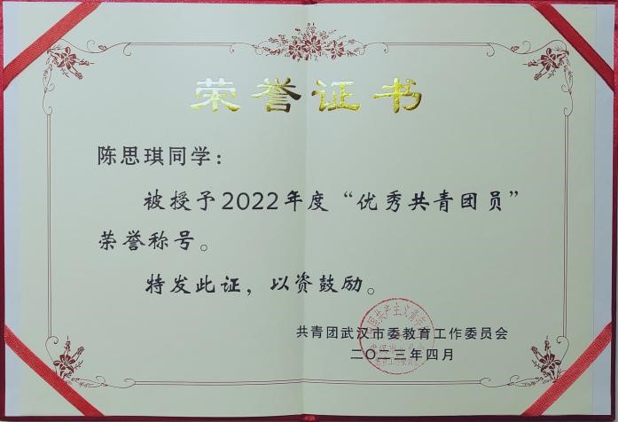 作为一名共青团员,陈思琪入校后便提交了入党申请书,并始终以党员的标准严格要求自己。从一名学生会干事到组织部部长到成长为医学院分团委副书记。在任期间陈思琪协助老师组织团务工作200余次,审核学院新闻稿件推文240余次,服务师生3000余人,荣获2023年团学突出贡献奖和武汉市2023年度“优秀共青团员”称号。 同时,她引导医学院团委宣传部加大力度改革,着力打造“党建带团建”、校内外媒体相应交融宣传的工作模式,在“清廉·青年”活动中大力组织宣传,十余篇推文被“荆楚网”“极目新闻”等网络平台报道。因宣传成绩突出,医学院获评校“最佳团队”。此外,陈思琪带领医学院分团委学生会积极推动开展符合医学生特色竞赛与活动,2024年上半年,医学院因此荣获“第二课堂”先进工作单位。2023年秋季运动会,在她和主席团搭档的密切合作和组织下,医学院勇夺校运动会团体总分第一,创学院建院最好历史成绩。