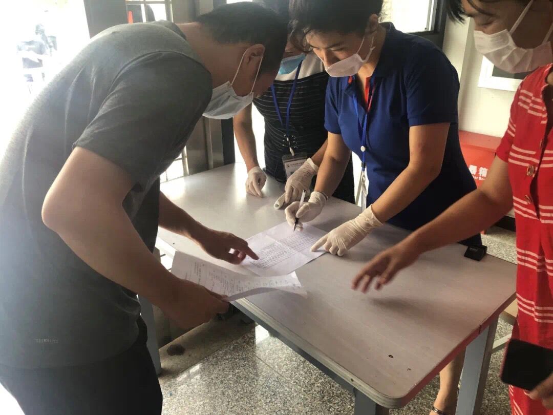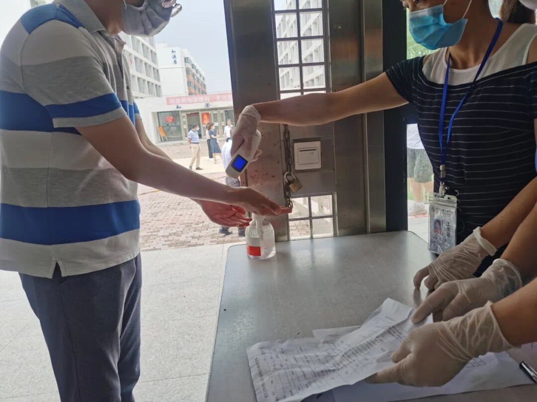 由教职工扮演的毕业学生在到达宿舍楼后,工作人员还会在楼前进行信息登记、体温检测。各宿舍门前,同学们严格按照1.5米间距有序排队进入,宿管阿姨依次要求同学们先使用酒精消毒手部,再用体温枪对手腕处进行温度测量,最后在登记表上进行信息登记,保证大家能够在宿舍楼内健康