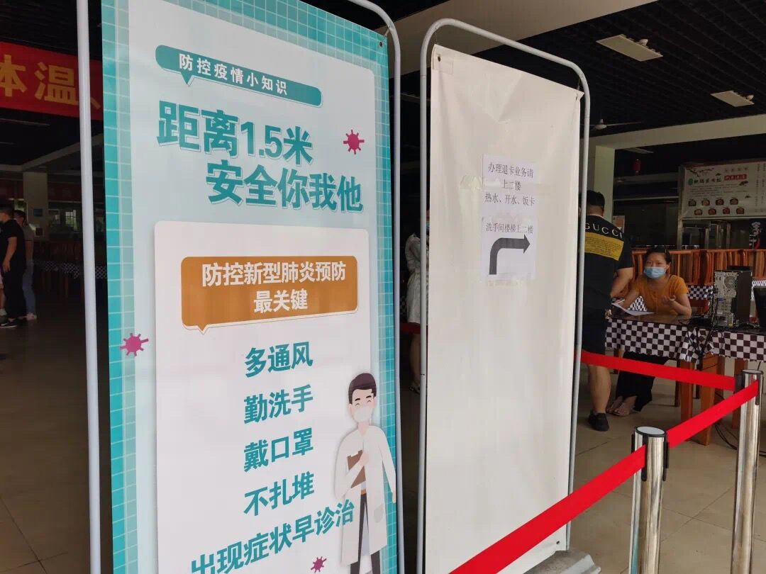食堂已经提前进行了全面消杀,为保障同学们就餐的环境安全,食堂大厅处也布置了红外线检测温度装置,“过关”后方可进入食堂内就餐。取餐时按顺序排队领取,入座保持安全间距,每个餐位学生需进行身份登记。