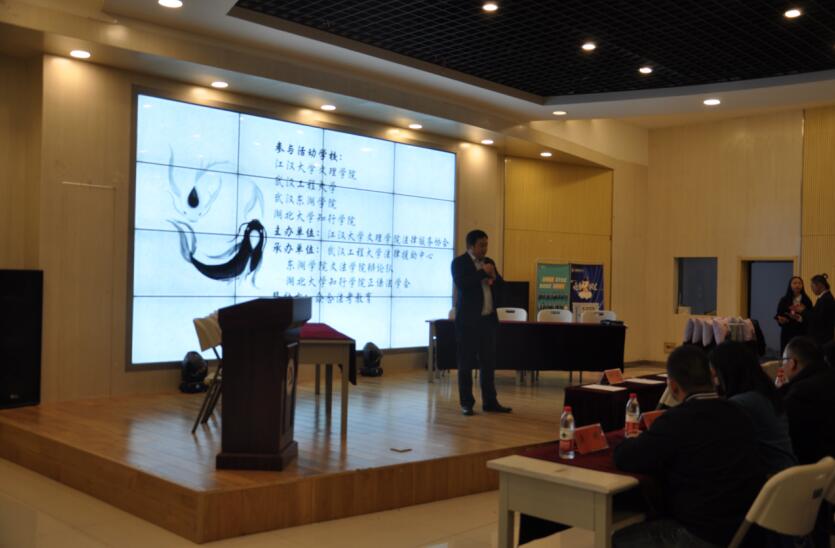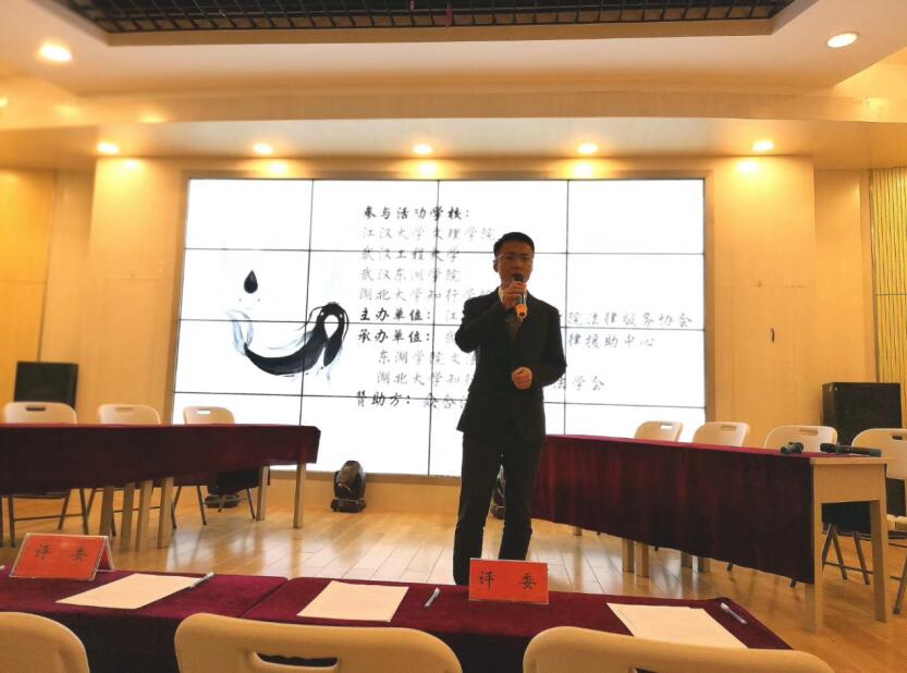 为了推进法学教育的发展,培育法科学生的思辨能力,提高普罗大众的法制意识,政法学院于2019年12月7日上午9点在19栋101举办第二届“明法杯”四校辩论赛。莅临大赛的嘉宾有:方圆众合教育华中区总监、武汉市洪山区众合法律培训学校校长常春先生,武汉工程大学法律援助中心陈冯会长,武汉工程大学法商学院团委指导方程成,湖北大学知行学院法学教研室主任吴明老师、郭燕妮老师,武汉东湖学院文法学院法学教研室王黎黎老师,江汉大学文理学院政法学院院长李蔚老师,副院长陈海峰老师,法学系主任张卫容老师,法律服务协会指导老师吴蕾、法学系全体教师,和来自武汉工程大学、湖北大学知行学院、武汉东湖学院及江汉大学文理学院等高校的选手同台竞技、博弈“明法杯”四校辩论赛。