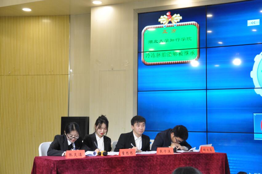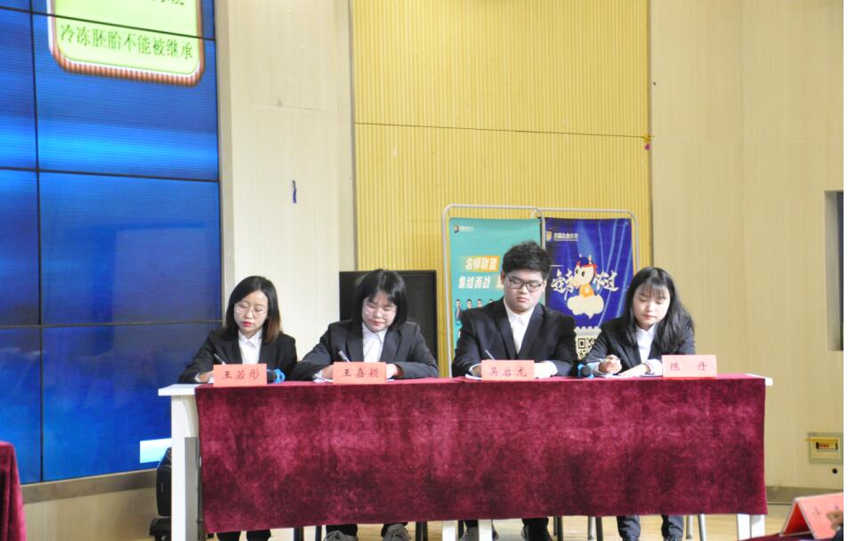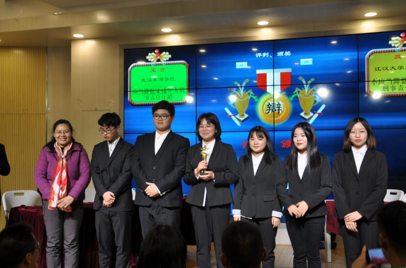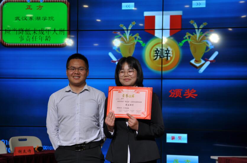 致辞过后,比赛开始。初赛第一场由武汉东湖学院对战武汉工程大学,辩题是“1.3& 1.5两个条款内容是在保护还是在限制微博用户”,正反双方就辩题展开了激烈辩论。初赛第二场由湖北大学知行学院对战江汉大学文理学院,辩题是“冷冻胚胎能否被继承”,正反双方也是激情碰撞,好不热闹。在经过评委的点评后,武汉东湖学院和江汉大学文理学院获得了初赛的胜利,晋级决赛进行冠亚之争。下午14点半,决赛打响。我校与武汉东湖学院展开最后角逐,就“是否应该降低未成年人刑事责任年龄”进行了激烈的辩论,在一番“唇枪舌战”后,经现场评委的点评与打分,以及现场观众的投票,我校成功问鼎第二届“明法杯”四校辩论赛冠军!同时,我校王嘉颖同学荣获本届四校辩论赛的“最佳辩手”!