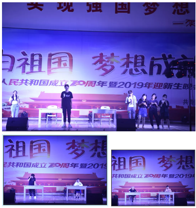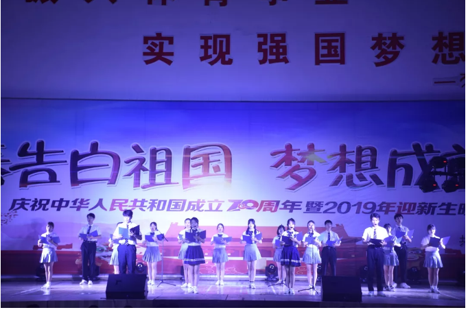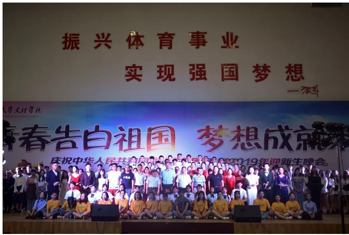 时维九月,序属三秋。由校团委举办的江汉大学文理学院庆祝中华人民共和国成立70周年暨2019年迎新生晚会9月25日在我校体育馆举行,党委书记杨知勤老师、副校长万波老师、党委副书记赵学迅老师、校长助理王明光老师、学生处处长曹灵海老师、校团委书记熊海洋老师、学生处副处长朱启贵老师、各二级学院综合办公室主任、分团委书记、新生辅导员及2200余名2019级新生观看了此次晚会。