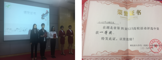 在上周日第十八届湖北省大学生心理健康联合会 “525”活动交流赛中,我校心协在“525”高校活动评选中获得一等奖。