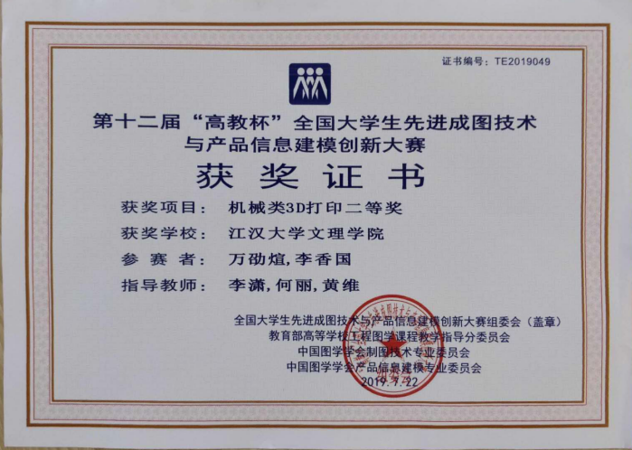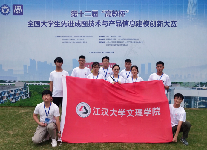 2019年7月20日——7月22日,2019年第十二届“高教杯”全国大学生先进成图技术与产品信息建模创新大赛在宁波举行。江汉大学文理学院由李潇、何丽老师带队,王喻、李香国、周文灿、万劭煊、许元慧、曾嘉雯、余龙龙、谌新、卢义国、乔旋西等十名同学参加了此次比赛。在与全国420所高等院校、4000余名学生同场竞技较量中,江汉大学文理学院学生荣获全国尺规作图一等奖1项、二等奖1项、三等奖2项,3D打印二等奖及团体三等奖。