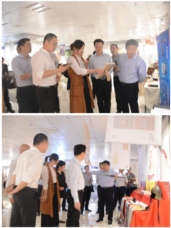 调研组一行还参观了我校2019届人文艺术学院本科毕业生作品展。在作品展的视频区,调研组领导们观看了黄陂旅游闯关的游戏,表示应该将这些以黄陂文化为背景的作品逐步商业化。