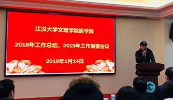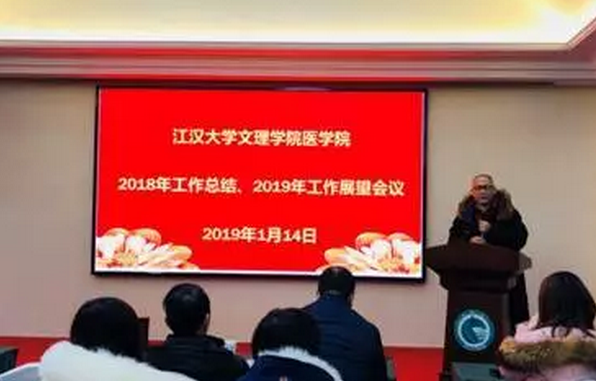 2019年1月14日下午,江汉大学文理学院医学院于马跡山生态农庄酒店四楼会议室,召开了医学院2018年工作总结、2019年工作展望会议。江汉大学文理学院校长崔东教授、副校长万波教授、副书记易凡老师及医学院全体教职工参加了此次会议。本次会议由医学院副院长管斌教授主持。
