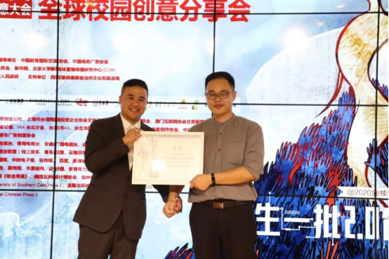 为感谢我校对金犊奖分享会的支持,张厚炜先生致赠感谢状予我校人文艺术学院常务副院长吴聪。