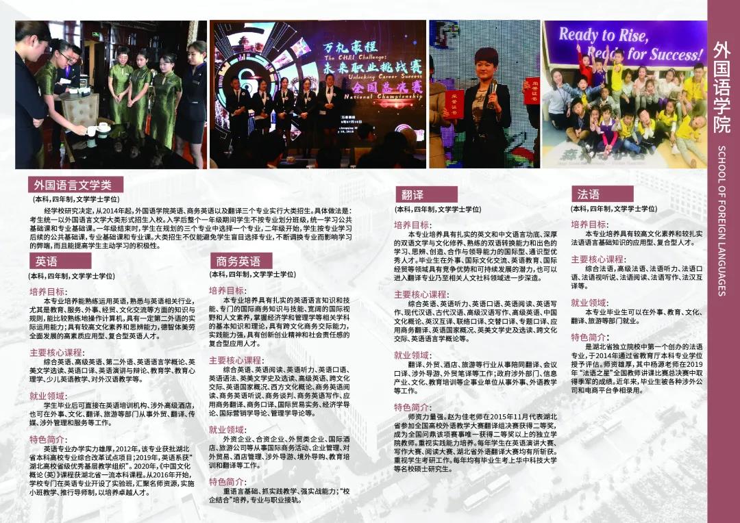 你想成为英语培训师,或者一线的翻译工作者,或者涉外公司驻外代表,又或者想考上心仪的研究生院校,请选择江汉大学文理学院英语专业,优秀的组织、优秀的团队正在张开双臂迎接优秀的学子,欢迎与我们一道再创外国语学院的辉煌!