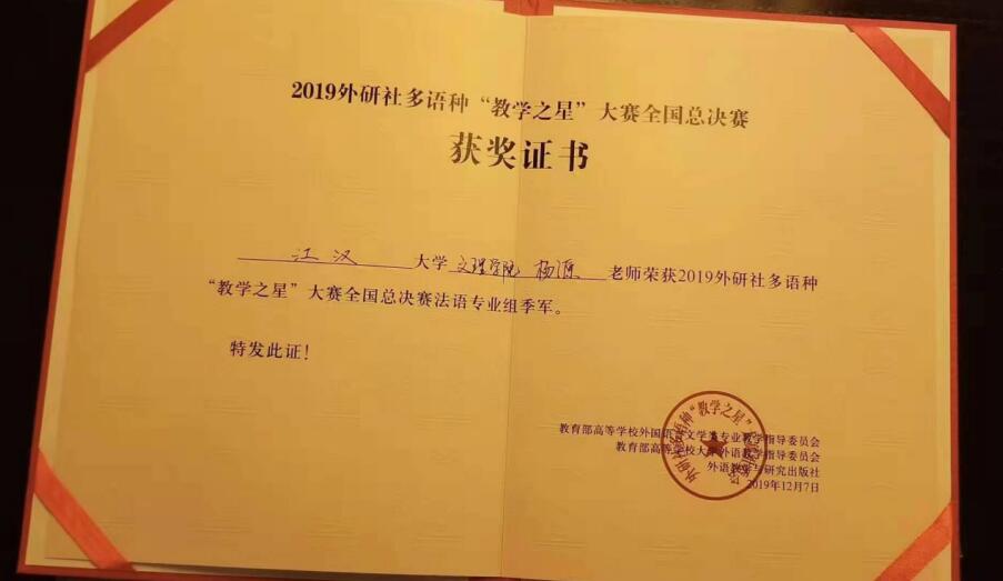 12月7日,在北京举行的2019年外研社多语种“法语之星”大赛的全国总决赛上传来喜讯,外国语学院法语系教师杨源老师在总决赛中进入前六名,取得了全国季军的优异成绩。