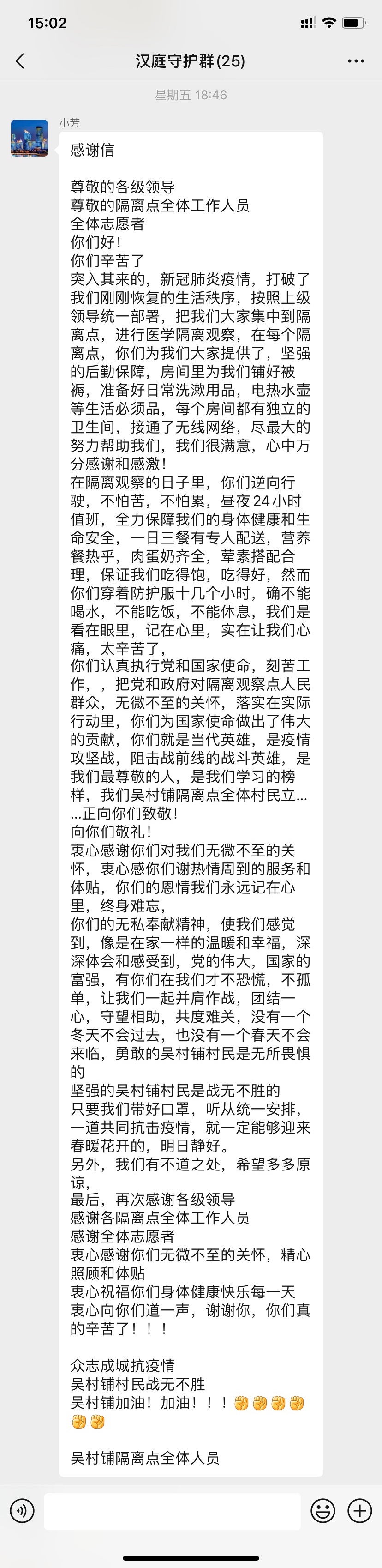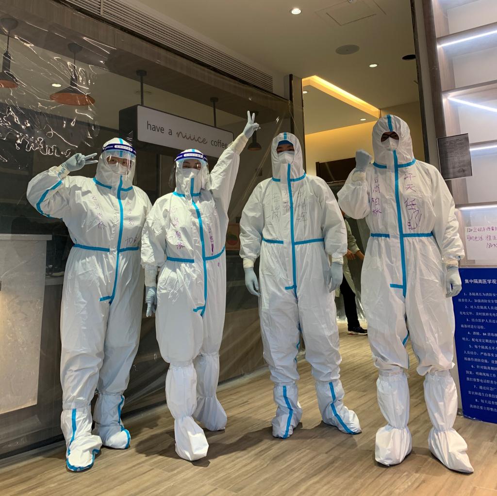 许笑扬同学在一家酒店隔离点当志愿者,每天早中晚都要和其他志愿者、医护人员轮班送餐,送餐人员需要穿上防护服进入污染区,进入后先发餐,然后发隔离人员的生活用品,收拾隔离人员的生活垃圾。最后背上消毒液喷雾筒,一层一层楼消杀,然后回到半污染区脱防护服。白天上午和下午要给每位隔离人员房间打电话,记录体温,询问身体情况,告知一些通知和注意事项。她说“刚开始穿着防护服,带着N95口罩和面屏,加上拎着大包小包的东西爬楼梯,感觉十分沉闷,没过多久就气喘吁吁,汗也浸湿了衣服。后来也就慢慢适应这份高强度的工作。”她用行动告诉我们:中华少年,顶天立地,当自强,00后已经长大了,现在换我们来保卫国家,守护人民。