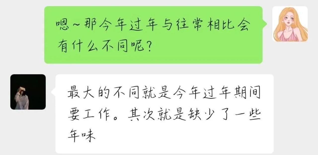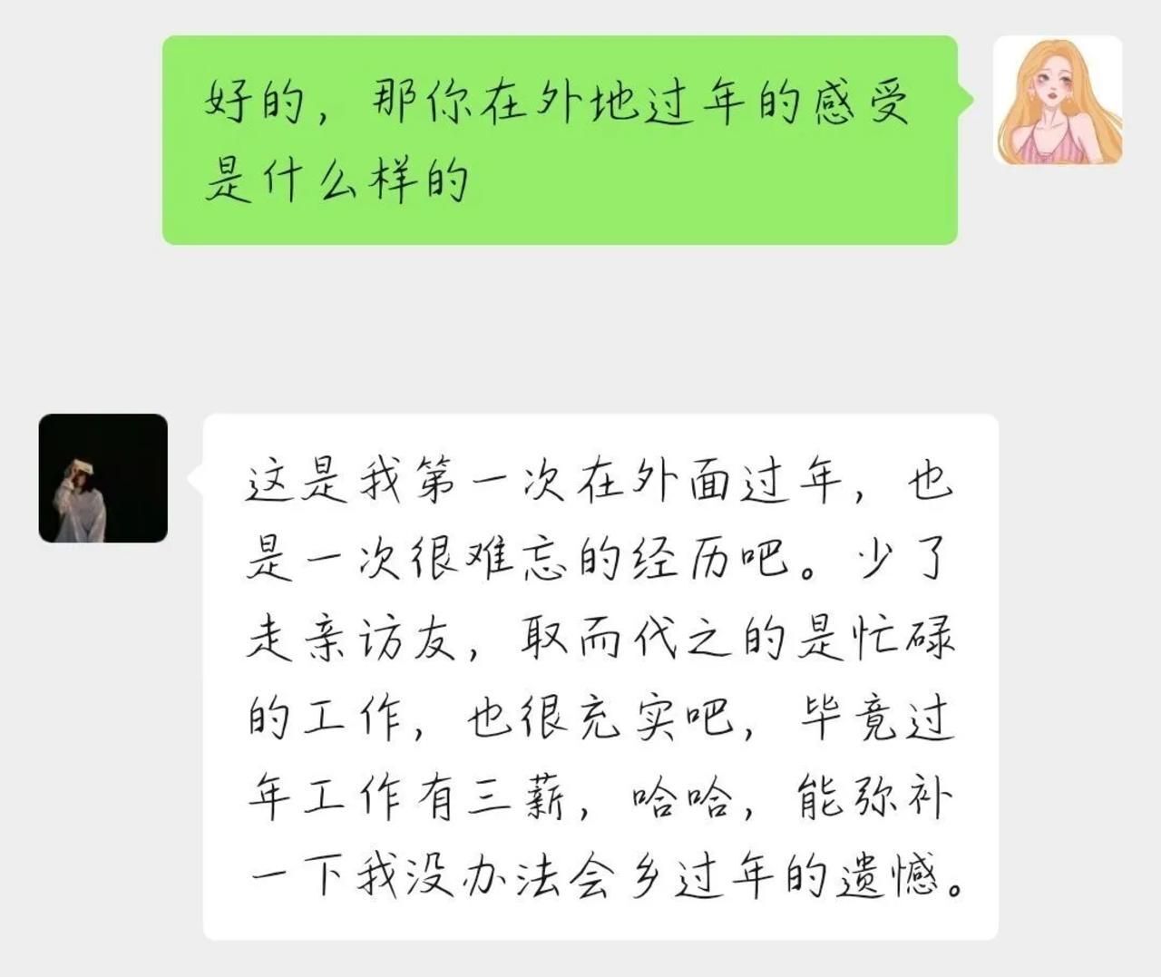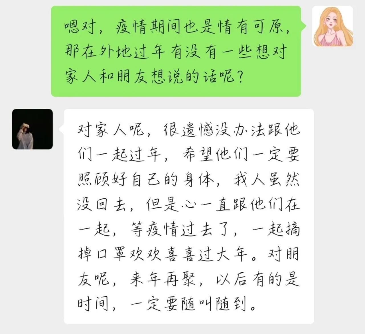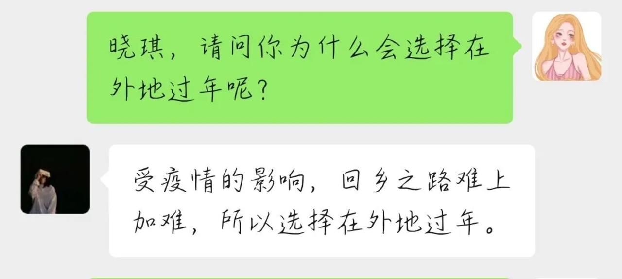 因为疫情,对于许多人来说,今年也将度过一个特殊的春节假期。虽然不能回到家乡、缺少家乡的年味。但疫情当前,刘晓琪仍义无反顾选择留在异地,同时,这也是千千万万“春节异乡人”的真实写照。