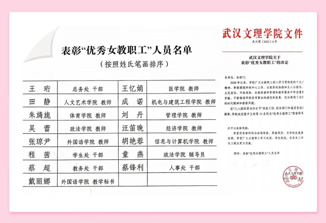 为热烈庆祝国际“3.8”劳动妇女节,在广大女职工中弘扬先进,树立典型,激发全体女职工奋发向上、建功立业的精神。经各学院和基层党组织推荐,学校共评选出15名优秀女教职工。她们怀着对教育事业的满腔热情,以强烈的使命担当,扎根一线,勤奋工作,服务师生,在平凡的岗位上做出了不平凡的成绩。让我们致敬了不起的“她们”。