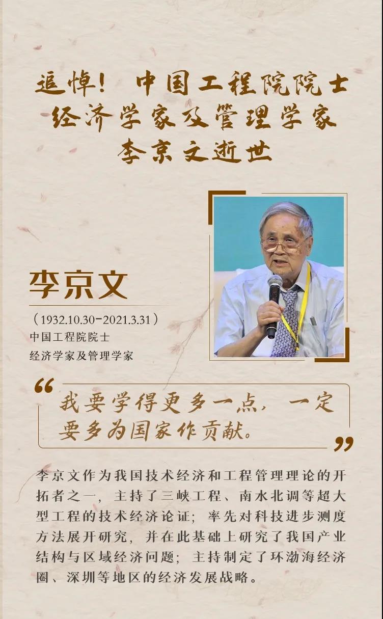 中国工程院院士、著名经济学家及管理学家李京文,因病医治无效,于2021年3月31日在北京逝世,享年89岁。