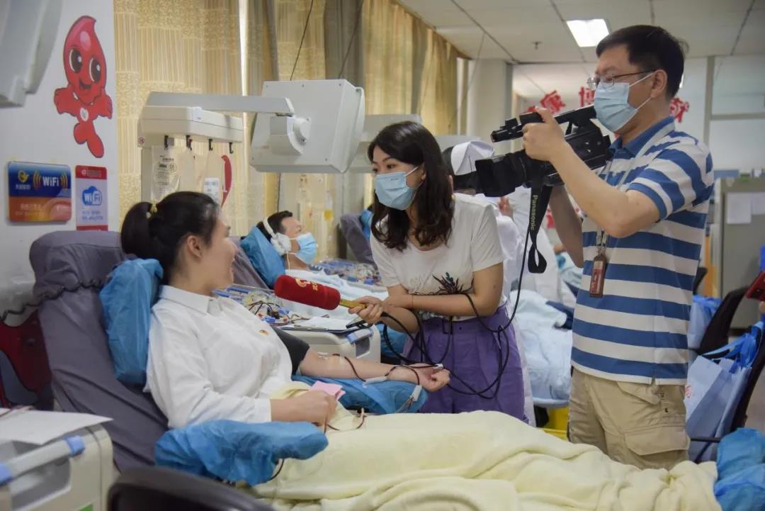 献血过程中的高宁霏接受各大媒体的采访
