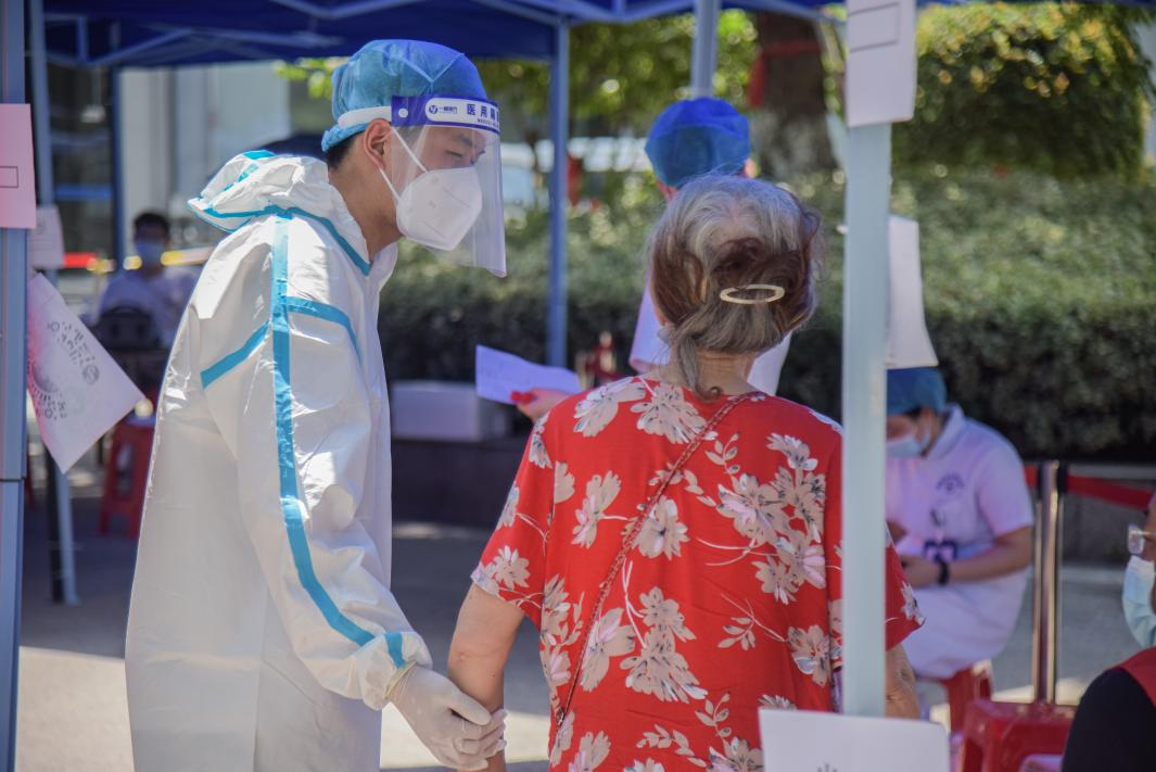 烈日当空,还要在老社区的楼房里上下攀爬。每到一家一户,都要重新换上防护服。他们协助医护人员顺利完成了核酸检测工作,也缓解了社区志愿服务工作的压力。在独居老人们感谢的话语中,他们的脸如同花一般绽放。