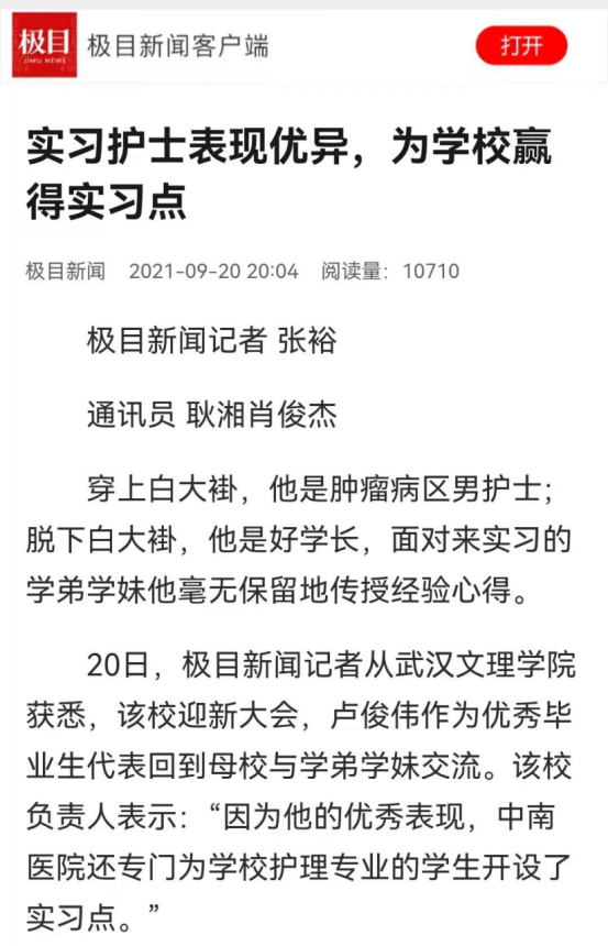正因为卢俊伟的优异表现,该院还进一步为学校增设了实习点。如今,卢俊伟不仅是该院的一名护士,他还是母校护理专业的校外指导老师。这个暑假,共有20名学弟学妹来到中南医院实习,而卢俊伟作为“过来人”,也毫无保留的教授相关经验和技巧。