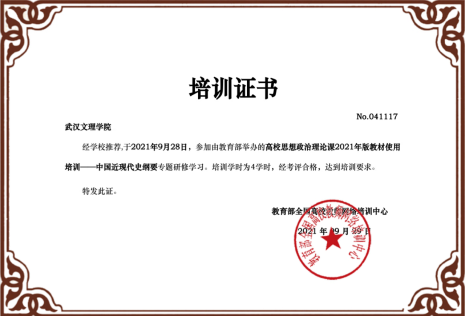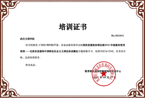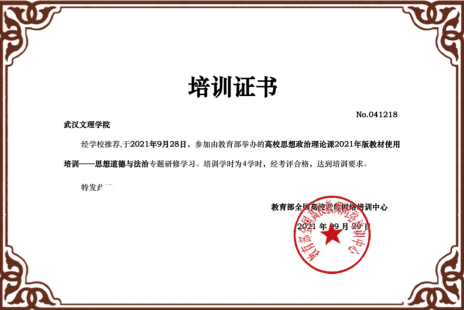 思想政治理论课部高度重视此次培训工作,由思政课部曹卓主任亲自负责,认真组织全体教师参加培训,并要求参训教师认真研读教材,在规定时间完成线上培训学时,并参加培训测试获得合格证书,确保培训效果。