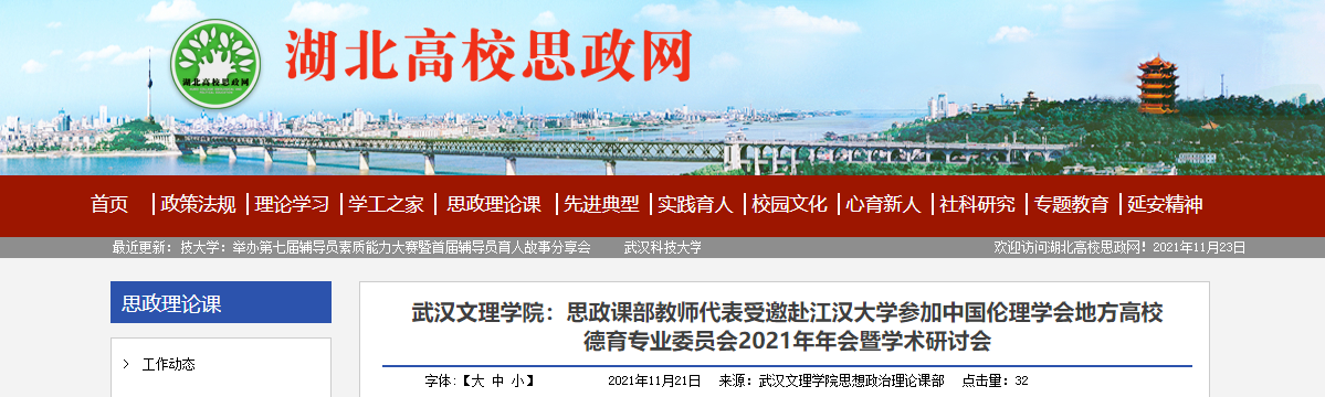 11月20日,星空下载游戏推荐免费版思政课部教师代表在党委书记杨知勤、副书记赵学迅的带领下,受邀赴江汉大学参加中国伦理学会地方高校德育专业委员会2021年年会暨学术研讨会。