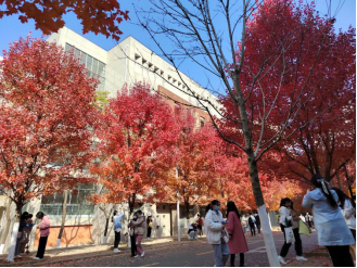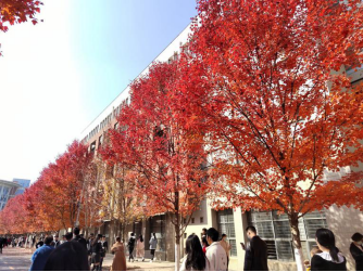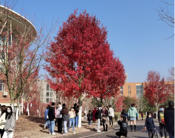 遍布于校内各处的红枫已基本红透,在暖阳的照耀下,显得格外艳丽,在这样阳光灿烂的日子里,感受秋的浪漫,令人心旷神怡。故杜牧诗言“停车坐爱枫林晚,霜叶红于二月花”,红火的枫树下,红烁摇曳,叶叶透露着深秋的气息,可谓是美不胜收。
