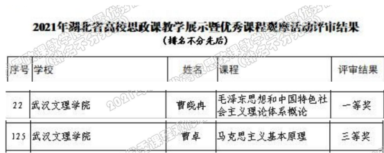12月10日,湖北省教育厅公布了2021年湖北省高校思政课教学展示暨优秀课程观摩活动评审结果的公示,我校思政课部曹晓冉老师讲授的《中国特色社会主义进入新时代》荣获《毛泽东思想和中国特色社会主义理论体系概论》课程一等奖,思政课部主任曹卓老师讲授的《社会基本矛盾及其运动规律》荣获《马克思主义基本原理》课程三等奖。