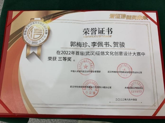 6月14日是全国第15个“信用记录关爱日”, 2022年首届(武汉)征信文化创意设计大赛颁奖活动于6月15日上午在中国人民银行武汉分行营业管理部圆满落幕。