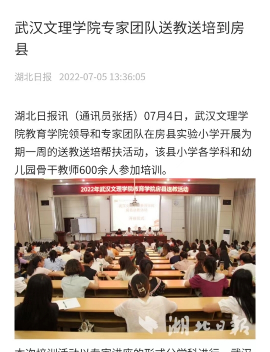 7月初,学校教育学院党总支书记曾鹏、副院长贺霞、综合办公室副主任杨帆等一行10人去到湖北省房县,展开了为期一周的“送教送培”帮扶活动,该县小学各学科和幼儿园骨干教师600余人参加培训。