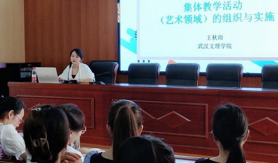小学教育系教师王秋雨分别从幼儿园艺术领域、中小学音乐版块进行了两场讲座,内容主要围绕幼儿园及中小学音乐教师教学及科研问题展开,为参加培训的老师们带来了新式教学方法,并现场亲身示范了具体内容。