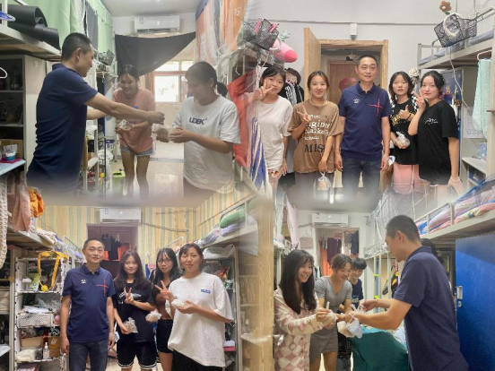 2022年9月9日下午,在体育学院行政副院长韩玮老师的带领下,学生管理办公室辅导员黄小斐、黄甜老师立即行动,第一时间借用推车迅速领取慰问物资送达至11栋寝室楼旁,并组织全年级班长团支书进行月饼的分装,现场工作有条不紊,秩序井然,很快便把7箱月饼分装完毕。