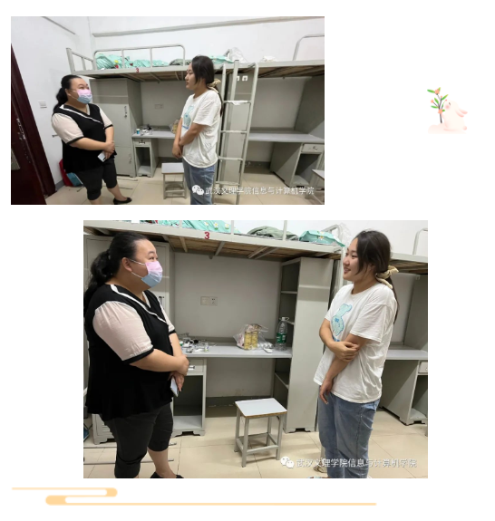 节日前夕,信息与计算机学院行政副院长武凌老师与22级新生辅导员郑悦老师前往包同学宿舍进行走访。武副院长对新生的到来表示了欢迎,并与学生进行了亲切的交谈,详细地了解了新生的家乡、住宿和生活情况等信息。询问了新生的适应情况,提醒注意寝室的各种安全问题,以防诈骗,加强寝室卫生防疫,老师们也针对包同学提出的疑问进行了耐心的解答。