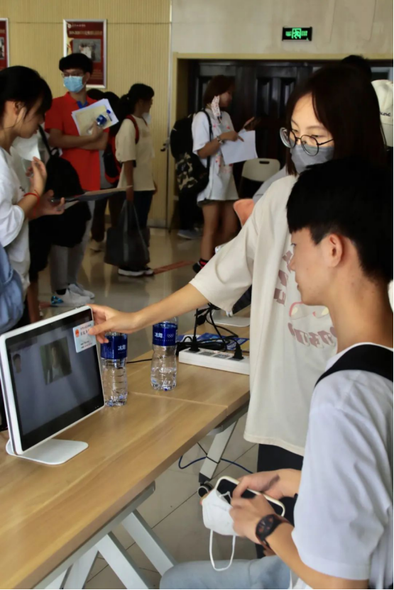 “体温正常,核酸正常。”校门口,大一新生出示绿色健康码、行程码、进校前24小时内核酸检测阴性证明、三天三检报告、并在校门口完成入校前的核酸采样,工作人员对行李进行消毒消杀,设置人脸识别系统以及大数据统计系统,快速完成学生身份验证。科学防护与精心服务相结合,给同学们带来了满满的安全感。