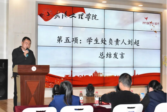赛后,学生处负责人刘超做总结发言。他充分肯定了参赛选手的精彩表现,指出选手们语言表达思路清晰,班会内容形式丰富,对于主题班会把控到位,班会整体展示效果较好,并对班会的素材使用、层次设计给予了建议。此外,他表明主题班会作为高校辅导员开展思想政治教育工作的载体,是实现“立德树人”育人目标的重要途径,充分体现了辅导员的教育智慧和专业化水平。