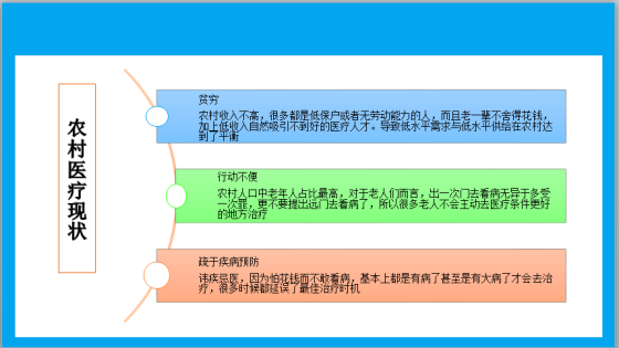根据对李寨村实地的调查研究,前期调查中,政法学院志愿者结合资料发现李寨村医疗存在以下三个现状。第一,农村经济发展比城市发展慢,医疗设备较老旧;第二,部分村民由伤病等原因,行动不便,就医出行较困难;第三,农民对于疫病预防的知识欠缺。基于以上现状得出了李寨村医疗水平整体落后的结论,农村的疫病预防宣传工作更需要加强。