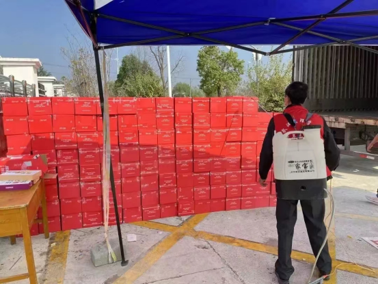 熊海洋书记组织现场的工作人员搬卸和分发物资,老师和学生们搭成人力“传送带”,接力将货物搬运卸下,力求在最短的时间里完成货物交接。工作人员及时对捐赠物资进行消杀,严防死守,隔绝疫情传播的可能性。完成消杀后,工作人员将捐赠物资登记,并通知人文艺术学院学生和各学院、各部门老师及时领取分发物资。