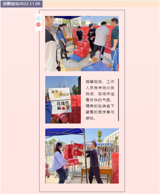 轩妈品牌的主要特点就在于新鲜即食,食品保质期仅20天。在捐赠过程中存在的最大难点在于如何将食品在最佳食用日期内运抵学校。企业先与校方对接好接收日期,再与工厂对接生产时间,紧接着联系物流跨省运送,提前根据当地疫情防控政策及时协调运输;当物流运抵武汉市后校方派出熊海洋书记去到高速收费站,陪同司机完成入鄂核酸检测,健康码核查等一系列疫情防控流程,保证食品品质的同时也兼具疫情防控,用爱破除疫情的阻挡。