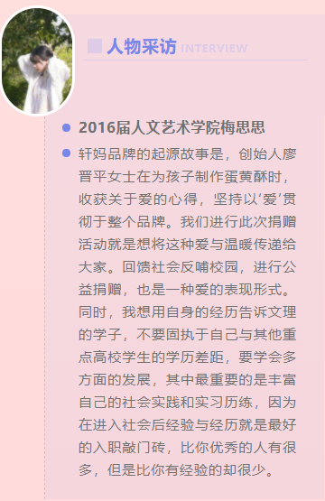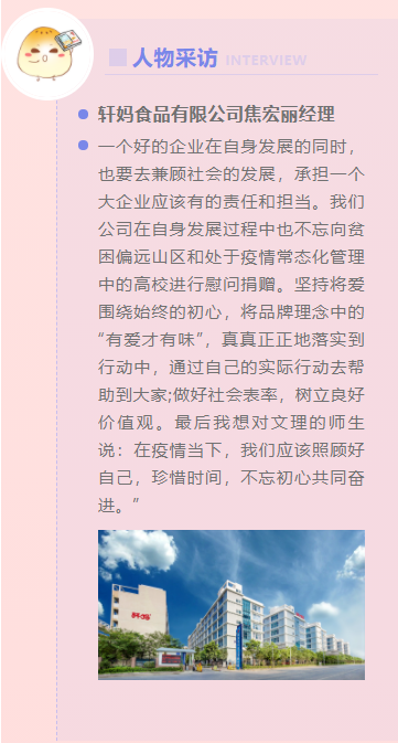 大爱无言,善举无价。此次捐赠体现出企业的社会责任感,勇于担当博爱无私,也展现出校友对于学校的感恩反哺情怀。熊海洋书记作为校方代表想对轩妈食品有限公司说:企业在发展过程中除了需要注重经济效益之外,还需要注重社会效益,唯有两者同时兼顾的企业才能成为中华民族的坚强支柱。轩妈食品有限公司正是充分做到了这点,在自身经济效益不断扩大的同时,通过捐赠回馈社会,其行为展现出高度的社会责任感,同时也体现了我们中华民族的团结一心,共创辉煌的雄心壮志。