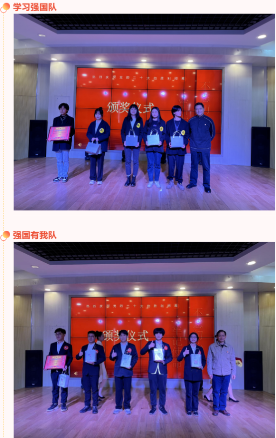 在游戏中寓教于乐,同学们通过对二十大相关词汇的解答、描述以及演绎,加深了对相关精神的理解,推进二十大精神入脑又入心,争做时代新人。伴随着诗朗诵《二十大之歌》,游戏逐渐进入尾声, 经过数轮角逐累计得分,本次知识竞赛获得一等奖的队伍是学习强国队,获得二等奖是强国有我队 ,获得三等奖是不忘初心队,获得优秀奖分别是心中有党队和青年先锋队。