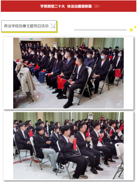 为了全面学习把握贯彻落实党的二十大精神,推进党史教育学习常态化长效化,政法学院党总支于2022年11月16日中午12时30分在19栋101教室开展《学思践悟二十大,依法治国谱新篇》主题党日活动。