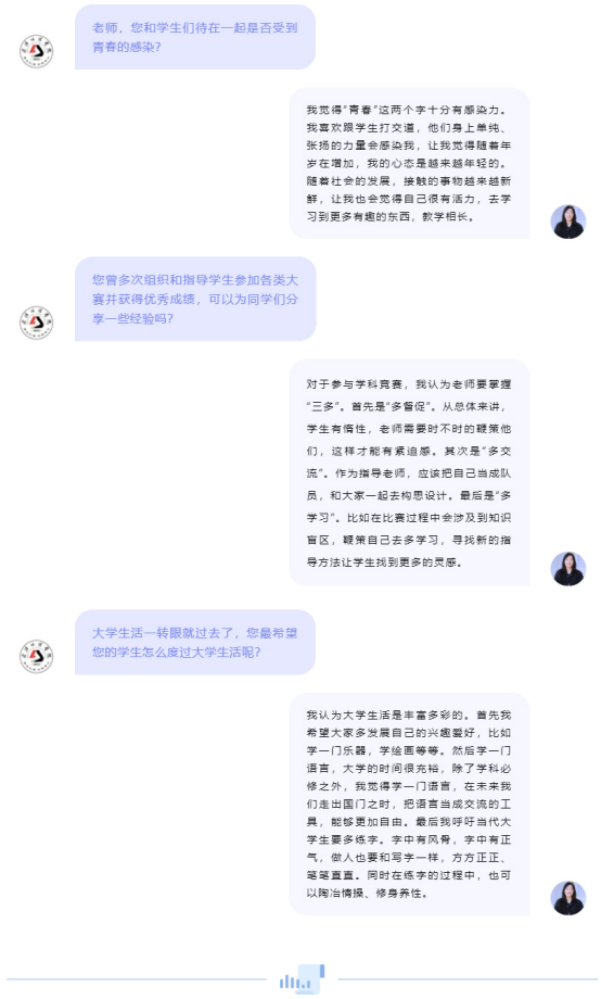 实践是检验真理的唯一标准。王玮婧从讲述者转化为探索者,带领大家在寻求真理的世界遨游。她生动、有特色、极具灵活性的课堂培育出了许多优秀学生。善于走近学生的她,了解学生的学习和生活状况。饮其流者怀其源,学其成时念吾师,她的温暖直戳学生们的心灵。“千里马常有,而伯乐不常有”这是同学们对她的真挚评价。师生互动产生了不一样的花火,温暖、感动的故事在他们之间不断上演。