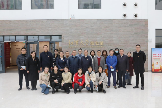 学校研学人员接受江汉大学赠送的党建书籍后,又参观了江汉大学图书馆并合影留念。