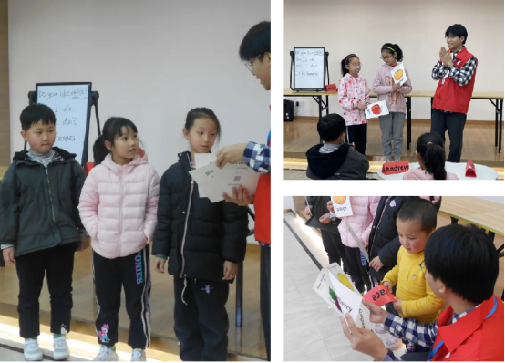 从一首美妙的英语歌曲开始,志愿者们带着小朋友们进入了英语课堂。热心的志愿者给每位小朋友发放了英语名卡片,在激发小朋友学习的热情后,志愿者王锦拿出了准备好的小卡片,教小朋友认识常见水果的英语和如何用英语表达自己喜欢的水果。为了巩固小朋友们对单词的熟练程度,王锦用英语对话的形式与小朋友进行买卖水果的游戏,以此加深小朋友对单词的印象。