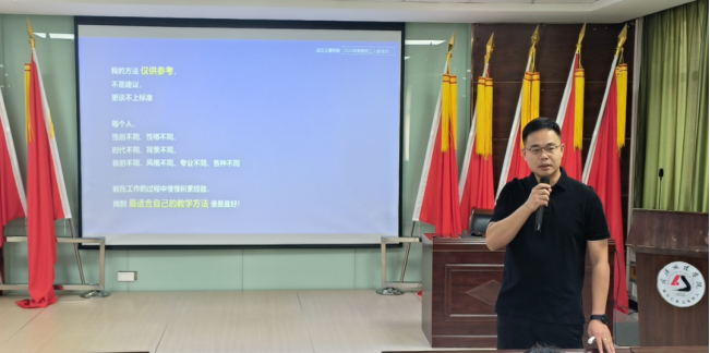 外国语学院教学副院长徐江副教授以“怎样上好一节课”为主题,从“课前准备、课中表演、课后检查、课程反思”四个方面进行讲述,并拓展到从板书、教案、练习与作业等方面对新进专任教师展开专项培训。
