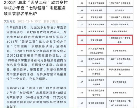 此外,湖北省文明办、团省委联合发布的2023年“圆梦工程”助力乡村学校少年宫“七彩假期”志愿服务项目表彰名单也于近日揭晓,我校“文理七彩少年”教育服务队获得“优秀志愿服务团队”称号。