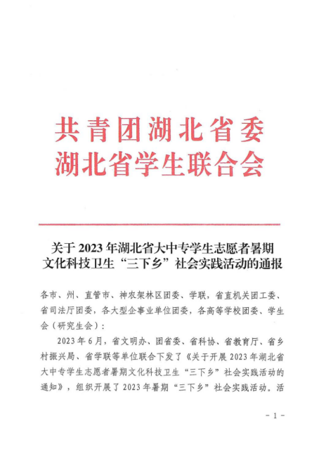 近日,团省委湖北省学生联合会发布《关于2023年湖北省大中专学生志愿者暑期文化科技卫生“三下乡”社会实践活动的通报》,我校新星志愿服务队荣获2023年暑期“三下乡”社会实践活动优秀团队称号,肖昌浩然、余赛凤荣获2023年暑期“三下乡”社会实践活动先进个人称号。