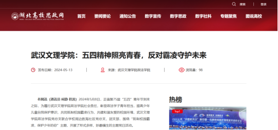 2024年5月,星空下载游戏推荐免费版政法学院党总支联合胜海社区党总支、团支部,举办了以“抵制校园霸凌,保护少年的你”为主题的党日活动,旨在增强少年儿童自我保护意识,共同抵制校园霸凌,营造和谐友爱的校园环境。此次活动得到了湖北高校思政网以及今日湖北等媒体的广泛关注和报道。