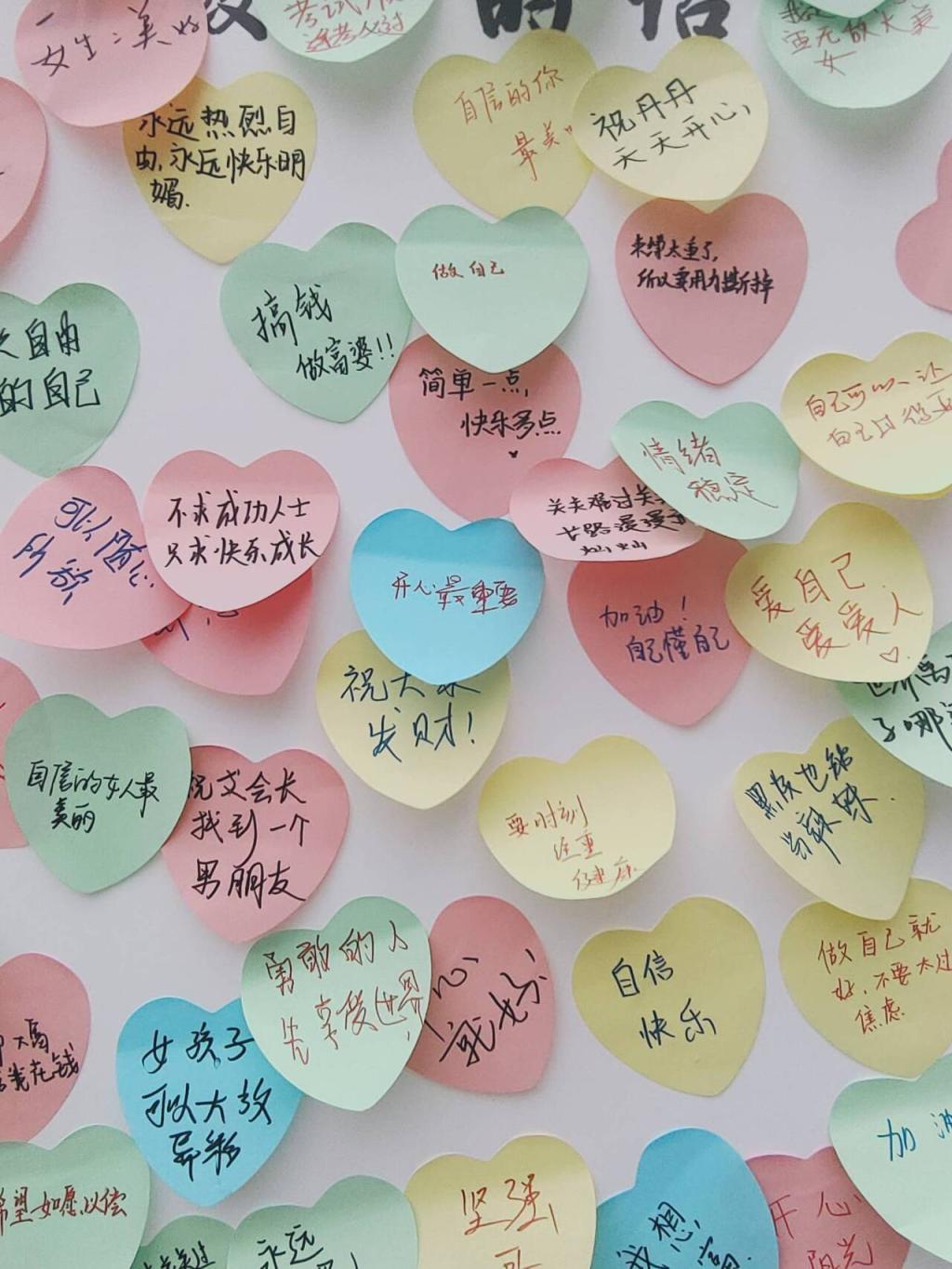 “撕掉标签,做不被定义的自己”活动现场,同学们纷纷踊跃参与,亲手撕下那些刻板标签,写下内心寄语,将一面原本空白的纸质墙装点得五彩斑斓,充满了“正能量”。