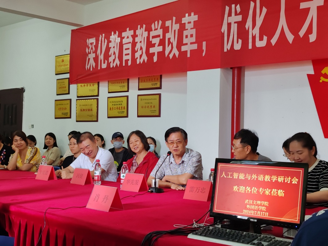 外国语学院特邀武汉翻译协会会长华先发教授、湖北大学冯健教授、学校督导雷万忠老师、武汉大学赵为佳博士,就大学英语教师们非常关心的AI工具将在多大程度上改变大学英语教学方式,以及这些工具是否会改善同学们的英语学习效果等问题进行研讨。