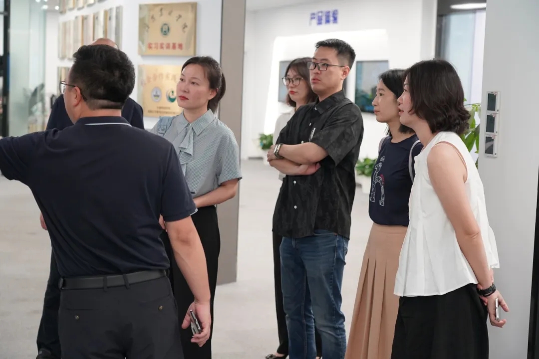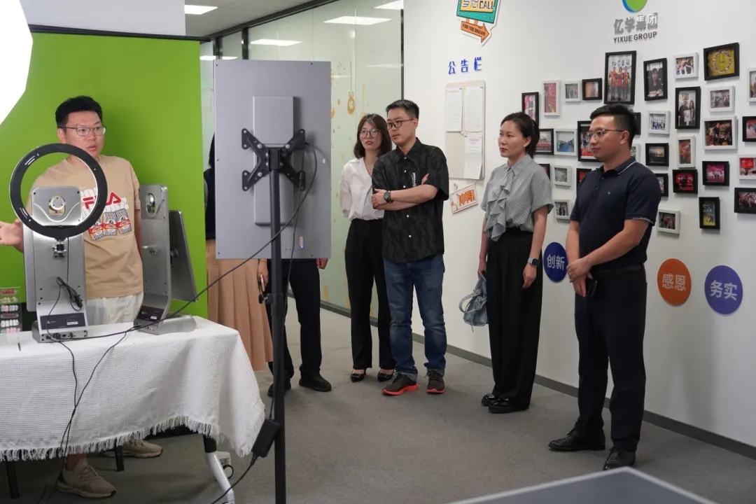 学院领导、老师在亿学集团副总经理的陪同下,深入了解了该集团的发展历程、业务概况、智慧实训、师生服务、产教融合等多个方面。参访中,他们重点参观了跨境直播室,并着重了解了AIGC技术在高校教学的应用及案例,感受人工智能技术的创新赋能。