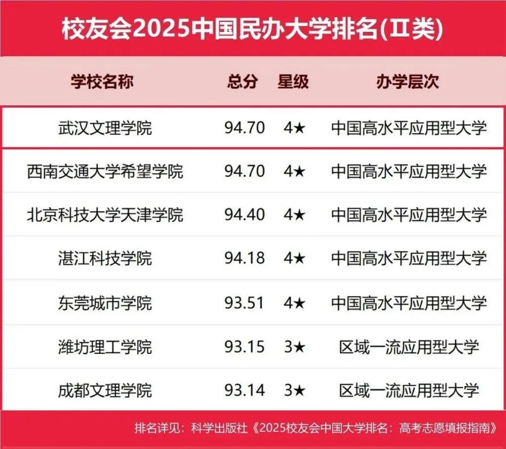 在校友会2025中国民办大学排名评价中,Ⅱ类院校为以理学及人文社科门类学科专业为优势的院校。学校的综合办学实力、人才培养水平与社会声誉受到第三方权威排名机构和社会各界的高度肯定。