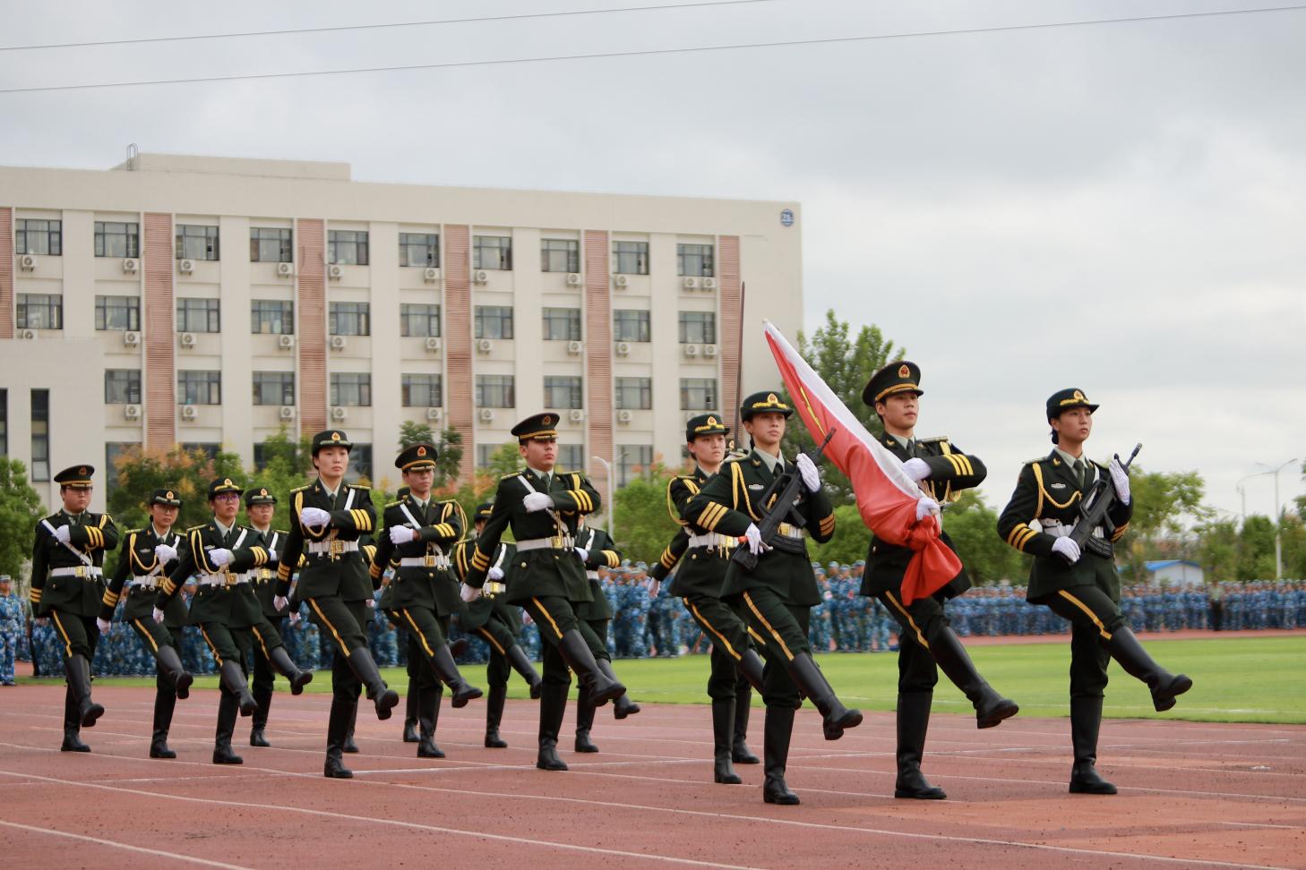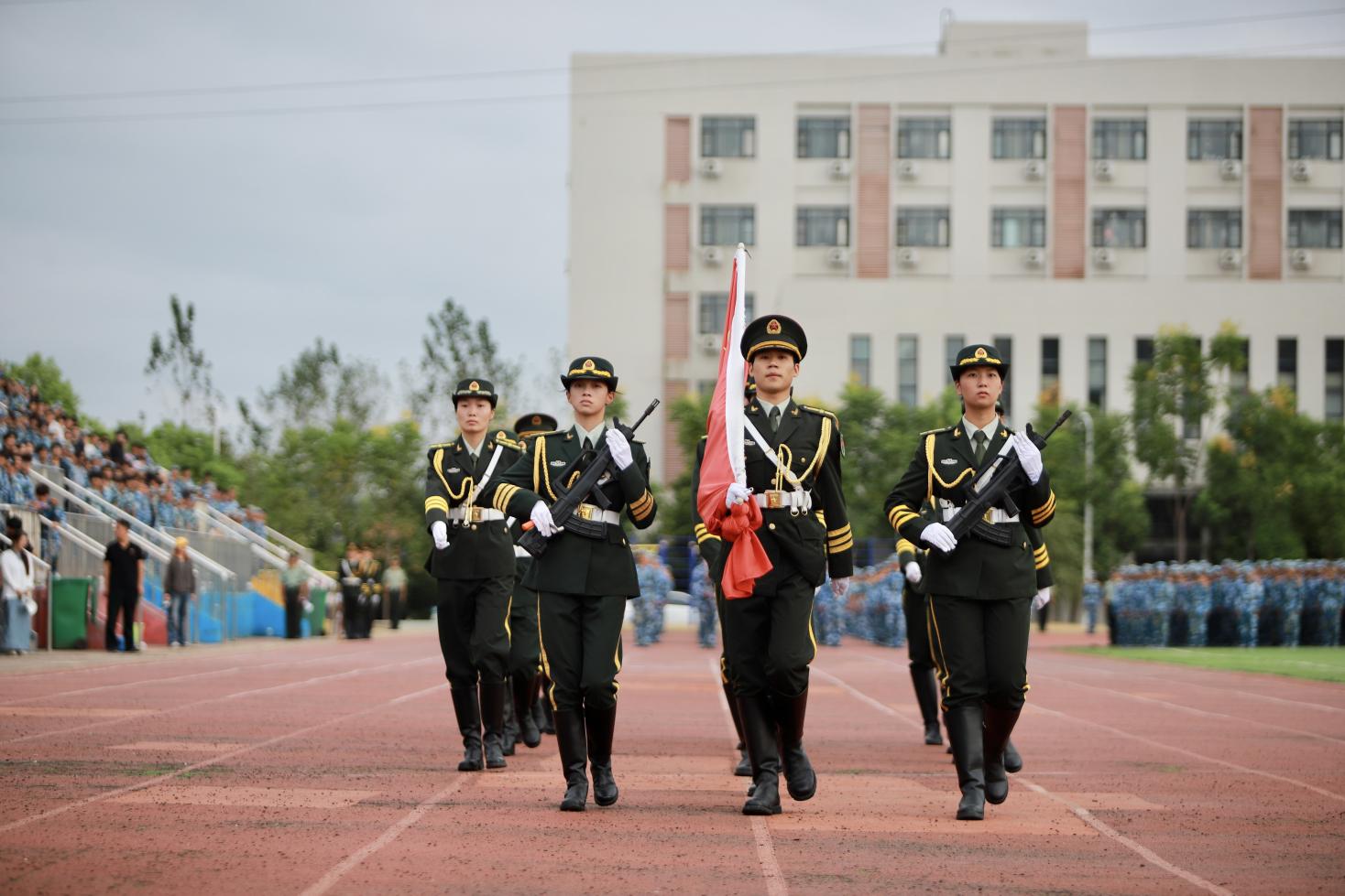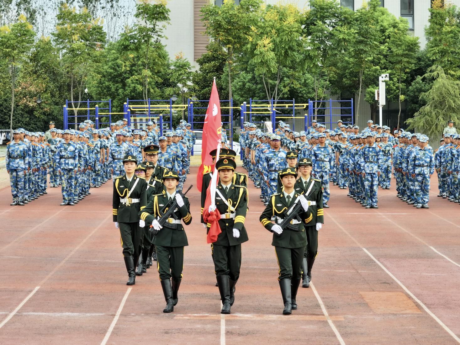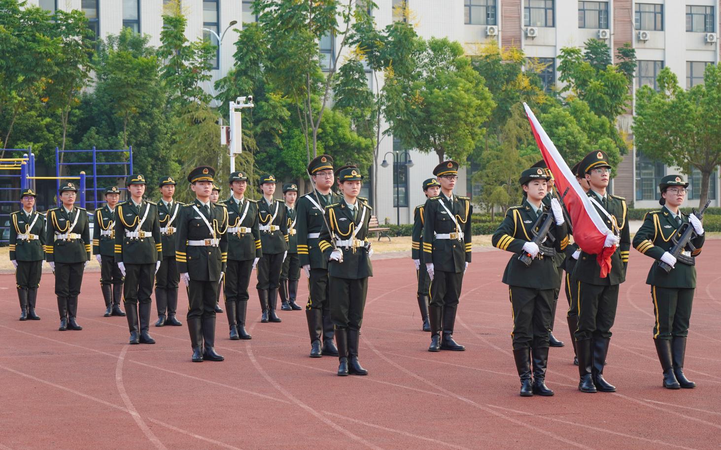 除了升降旗任务,国旗护卫队还承担着校级重大场合的仪仗任务。在开学典礼、军训闭营仪式和运动会等活动中,他们以严整的军容、整齐的动作,展现出国旗护卫队的威严与风采,时刻履行着护旗的责任。